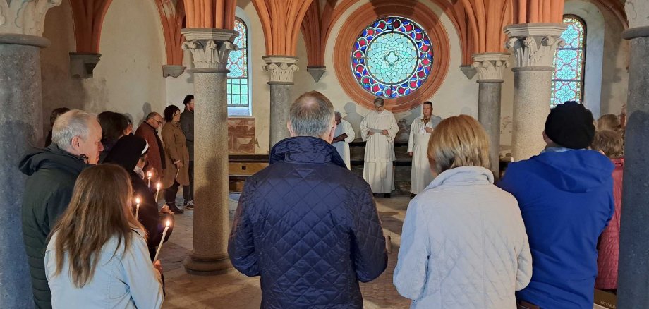 Der Kräutergarten wurde zum Garten Getsemani, der Kapitelsaal zum Gerichtsort des Pilatus, die Grabkrypta in der Abteikirche zur Grablege Jesu: mit zahlreichen Teilnehmenden begingen die Prämonstratenser in ihrer ehemaligen Abtei Rommersdorf im Neuwieder Stadtteil Heimbach-Weis ihren traditionellen Einstieg in die Osterfeiertage am Karfreitag. Einzigartig war dabei, dass sie die baulichen Teile der alten Abtei in die Passionsgeschichte einbezogen und somit besondere Bezüge für alle Mitfeiernden ermöglichten. Da klapperte beim Sturz Jesu mit dem Kreuz tatsächlich das mitgeführte Holzkreuz auf den Boden, und am Ende wurde tatsächlich das irdische Lebenslicht Jesu mit dem Friedenslicht aus Betlehem im Grab versenkt – um dann an Ostern als neues Licht an der Osterkerze die Auferstehung aufzuzeigen. „Viele Menschen suchen nach neuen Formen, den so alten und doch aktuellen Glauben zu entdecken“, erklären sich die Prämonstratenser-Tertiaren den Zuspruch zu ihrem Angebot. Dabei ist es keine Konkurrenz zu den übrigen kirchlichen Feiern: „Wir füllen sinnvoll die Stille zwischen Karfreitag und den Osternachtfeiern am Karsamstag. Damit sind wir Teil des großen Gesamt-Gottesdienstes zu Ostern, der am Gründonnerstag beginnt und bis zur Osternacht dauert.“ Die Botschaft vom Licht, das auf das Leiden folgt, sehen sie als „wichtige Grundbotschaft gerade in unserer aktuellen Zeit“ für alle Menschen an.